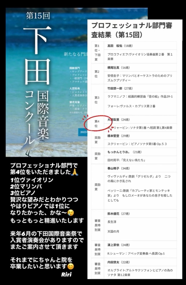第15回下田国際音楽コンクールのプロフェッショナル部門で第4位をいただきました🏆最近は修士論文にかける時間が増え、練習時間が減っていたので、たまには自分に圧をかけねばと思いエントリーしました1位と2位は他楽器ですので、ピアノでは2位ということになりますが、プロフェッショナル部門だけに「魅せる力」なども評価の対象だったのかなと思いますこれからも様々な人生経験を積みながら演奏力を磨いていきたいと思います😌